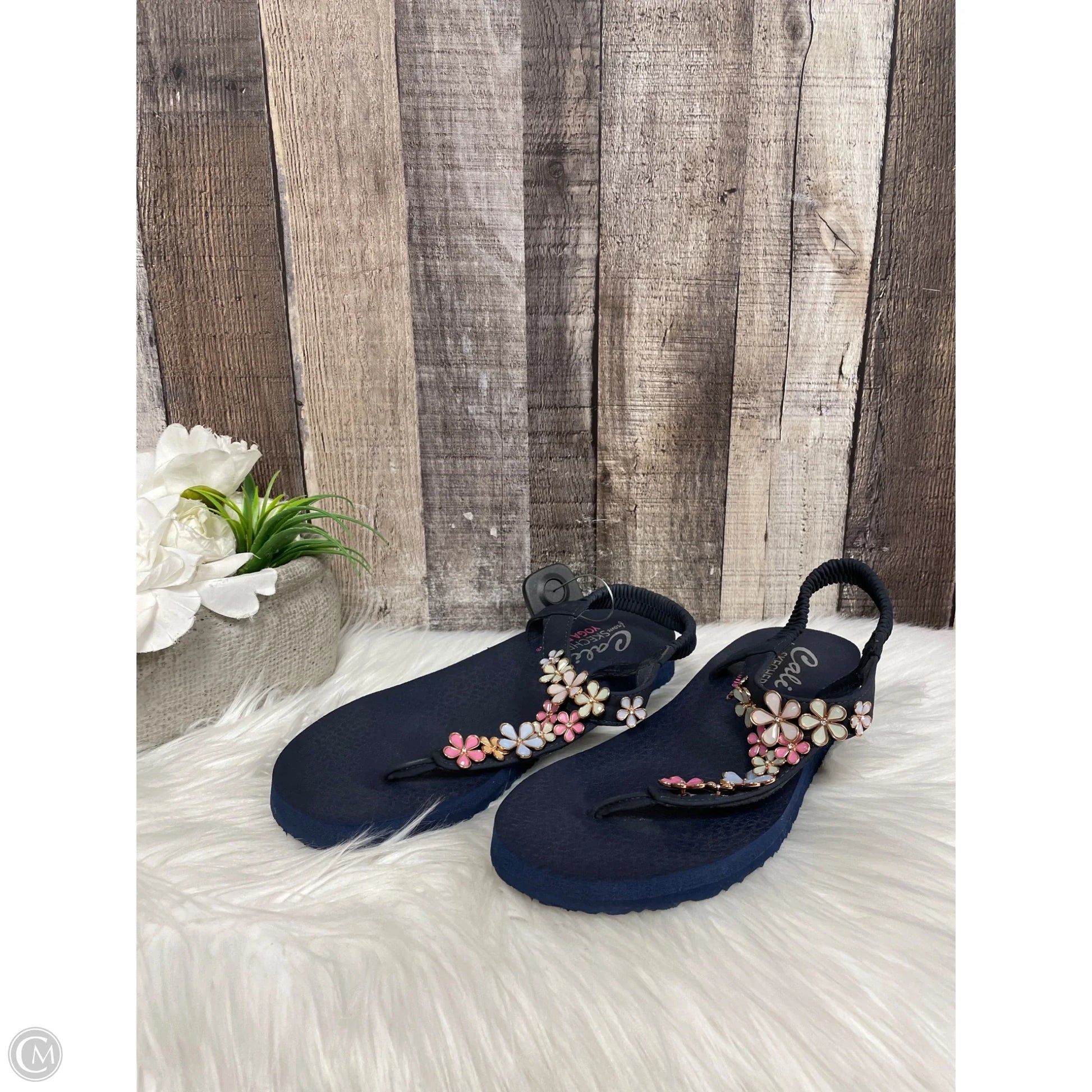 Step into style and comfort with Skechers Navy Sandals in size 8.5. Perfect for beach days or casual outings with a splash of charm!